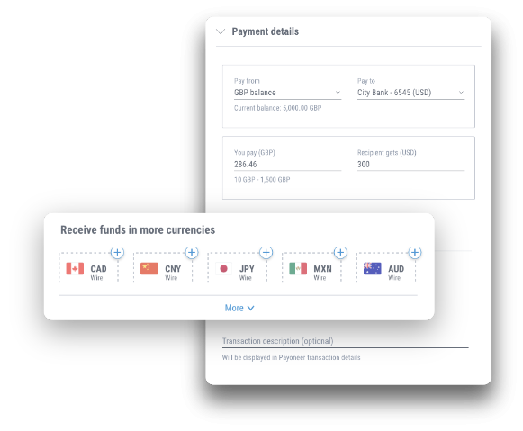 Nhận thanh toán nhanh chóng bằng USD, EUR, GBP, JPY, AUD & CAD qua tài khoản nhận tiền địa phương. Hỗ trợ nhận tiền từ 190+ quốc gia – giải pháp lý tưởng cho studio game, nhà phát triển ứng dụng và mạng quảng cáo di động.